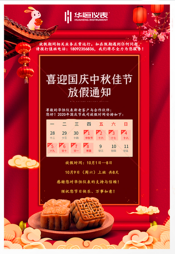您好!感謝您對(duì)華恒儀表的支持與信賴!2020年國(guó)慶佳節(jié)將至,在這舉國(guó)歡騰、普天同慶的時(shí)刻,華恒全體員工向您及您的家人致以最真誠(chéng)的祝福與問候!