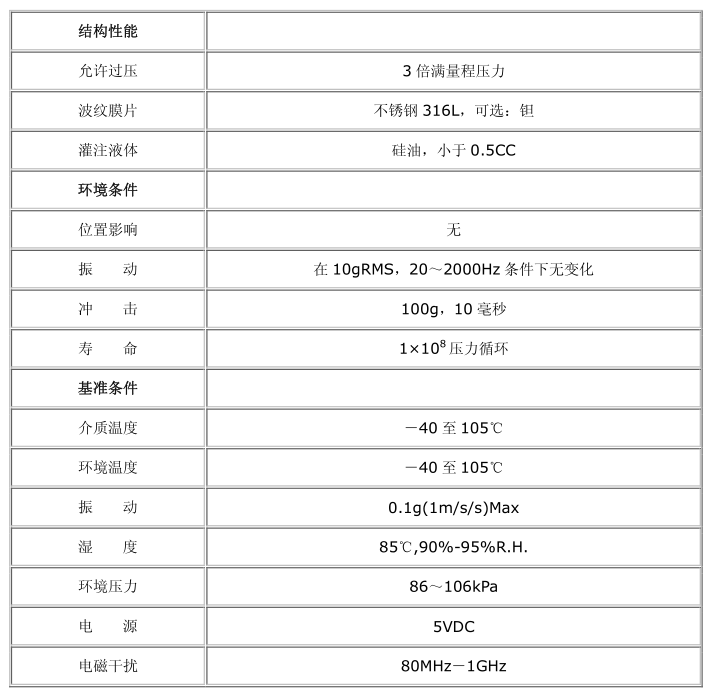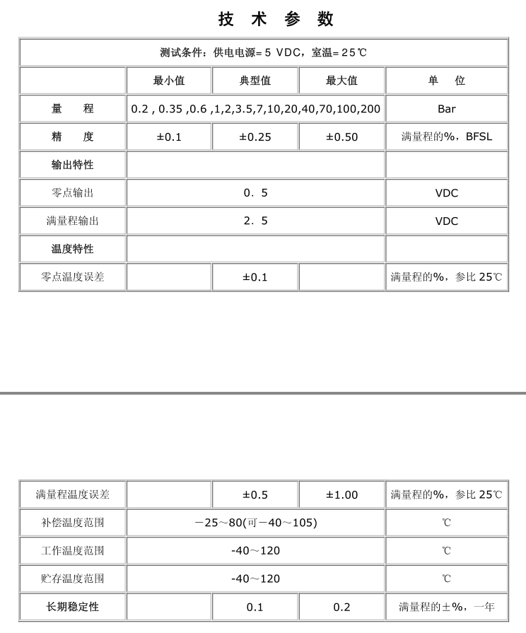 是將充油擴(kuò)散硅壓力傳感器芯體,通過(guò)激光焊接方式,裝入特定螺紋的壓力接口中組成。所有產(chǎn)品經(jīng)嚴(yán)格測(cè)試和篩選,利用MAX1452專用芯片進(jìn)行溫度補(bǔ)償和非線性校正,典型精度為0.25%,最高精度優(yōu)于0.1%,并保證在-25到80度工作溫區(qū)(最大可在-40到105度),全溫區(qū)測(cè)量精度在1%以內(nèi),5V供電,輸出0.5-2.5V電壓信號(hào),適用于各種不同壓力測(cè)量產(chǎn)品的組裝和生產(chǎn)。
