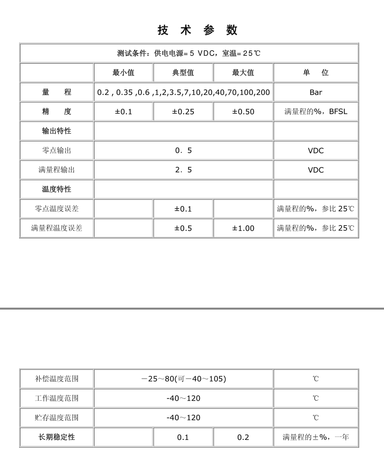 國產(chǎn)壓力變送器是將充油擴散硅壓力傳感器芯體,通過激光焊接方式,裝入特定螺紋的壓力接口中組成。所有產(chǎn)品經(jīng)嚴格測試和篩選,利用MAX1452專用芯片進行溫度補償和非線性校正,典型精度為0.25%,最高精度優(yōu)于0.1%,并保證在-25到80度工作溫區(qū)(最大可在-40到105度),全溫區(qū)測量精度在1%以內(nèi),5V供電,輸出0.5-2.5V電壓信號,適用于各種不同壓力測量產(chǎn)品的組裝和生產(chǎn)。