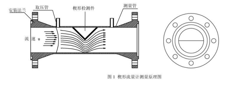 楔形流量傳感器結(jié)構(gòu)如圖1所示。楔形流量傳感器的檢測(cè)件是楔形孔板,它是一塊V形節(jié)流件,它的圓形頂角朝下,這樣有利於含懸浮顆粒(粉塵、泥沙及其它固體顆粒)流體和高粘度液體流過(guò)時(shí)在節(jié)流件上游側(cè)不會(huì)產(chǎn)生滯流,也不會(huì)在節(jié)流體上、下游側(cè)發(fā)生固體顆粒或粘稠物的積存,從而確保了楔形流量傳感器長(zhǎng)期運(yùn)行穩(wěn)定性:±0.1FS%Y,這樣高的長(zhǎng)期運(yùn)行精度在流量測(cè)量領(lǐng)域是迄今少見(jiàn)的。