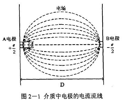 對(duì)于點(diǎn)電極的電磁流量計(jì)流量信號(hào)內(nèi)阻來(lái)說(shuō),如圖2-1所示,在絕緣襯里的傳感器測(cè)量管內(nèi)壁,裝有一對(duì)接液電極.電極是圓盤(pán)狀,直徑為d,電極A和電極B的距離(測(cè)量管直徑)為D(d<<D)。充滿(mǎn)導(dǎo)電液體的管道足夠長(zhǎng),電極所處介質(zhì)的電導(dǎo)率s和介電常數(shù)e是均質(zhì)的,對(duì)介質(zhì)內(nèi)的電流場(chǎng)不致有所改變。在這些假定條件下,電極實(shí)際上等于埋在各個(gè)方向具有無(wú)限深層的介質(zhì)內(nèi)。設(shè)兩電極間的電動(dòng)勢(shì)為e,A電極的電位為+e/2,B電極的電位為-e/2。從圖2-1可以看出,電流由A電極向介質(zhì)散流匯集于B電極流出。電流流動(dòng)時(shí)流過(guò)的截面在電極附近最小,以后離電極愈遠(yuǎn)愈大。也就是說(shuō)離電極愈遠(yuǎn)電流密度愈小,因而電場(chǎng)強(qiáng)度也愈小。由此可見(jiàn),在電流經(jīng)過(guò)的途徑每單位長(zhǎng)度上,介質(zhì)對(duì)電流的電阻愈遠(yuǎn)愈小.這樣,在計(jì)算傳感器信號(hào)內(nèi)阻時(shí),可以暫把流體的體電阻視為零,僅計(jì)算兩電極與介質(zhì)相接觸的接觸電阻。