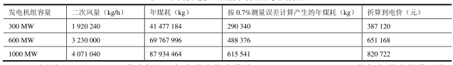 【示例二】電廠鍋爐,過量二次風(fēng)帶走大量熱量,增加煤耗。假設(shè)煙氣溫度120℃,空氣溫度30℃,因二次風(fēng)量測量精度提高0.7%,按年發(fā)電7000小時計算,可以減少煤耗為M*0.24*(120-300)/7000*0.7%,如果發(fā)電煤耗為每度電耗煤300克,每度電電價0.40元計算,由于采用平衡流量計,提高測量精度而節(jié)省的燃煤和降低的費用如表3所示。