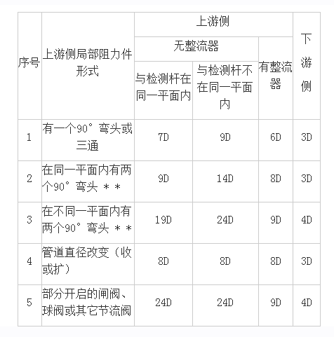 1、安裝檢測(cè)桿的測(cè)量段應(yīng)是直的,其上下游直管段長度參照下表所規(guī)定的長度,序號(hào)上游側(cè)局部阻力件形式上游側(cè)下。