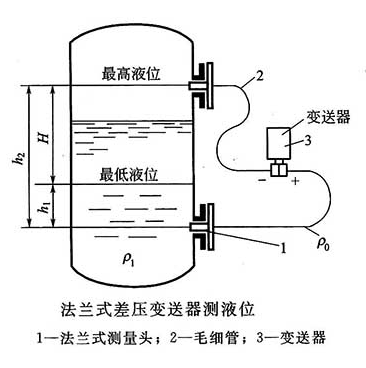 其中,H為儲(chǔ)罐液位,H0為差壓式液位變送器安裝位置距儲(chǔ)罐底部的距離,P1為儲(chǔ)罐內(nèi)部液體表面靜壓,P0為儲(chǔ)罐內(nèi)液體本身產(chǎn)生的壓力,ρ液為儲(chǔ)罐內(nèi)部液體的密度,ρ汽為儲(chǔ)罐內(nèi)部氣體的密度,P+為差壓式變送器正壓腔室內(nèi)部壓力,P-為差壓式變送器負(fù)壓腔室內(nèi)部壓力。