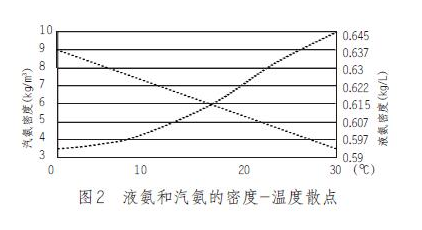 為了進(jìn)一步分析被測(cè)介質(zhì)氨的密度與溫度之間的對(duì)應(yīng)關(guān)系,根據(jù)表1的數(shù)據(jù),描出了汽氨和液氨的密度—溫度關(guān)系散點(diǎn)圖,見圖2。